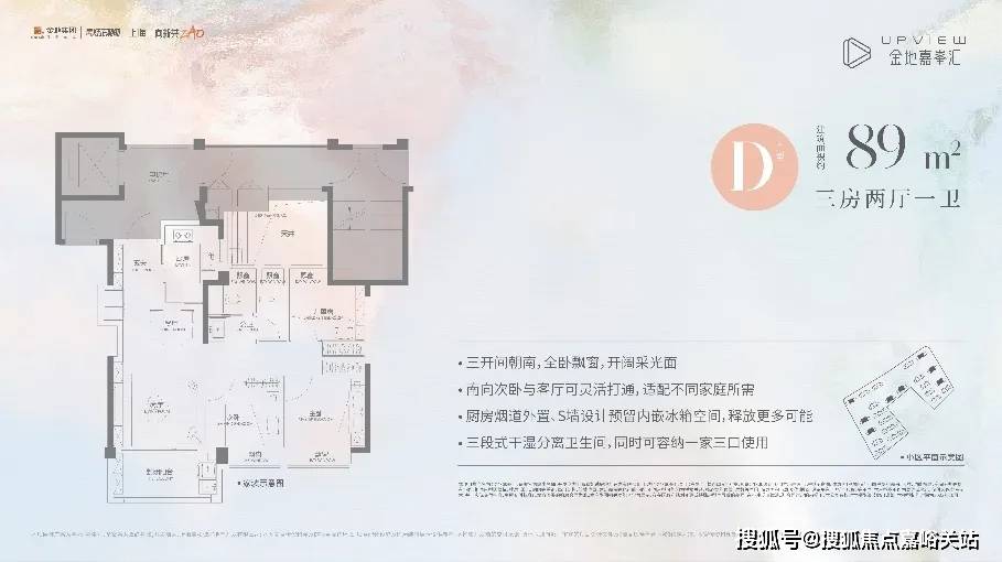 还有很多人性化创新细节,比如烟道外置,释放厨房操作空间;S墙内嵌设计,可容纳冰箱等大件家电!在同步继承百平户型优势的基础上,针对小户型空间有限的客观现实,做出了对应的设计。三分离卫生间,不仅将“一卫”的空间还给了其它房间,更可容纳一家三口分别使用不同功能区,增加空间利用率。三卧室带飘窗,提升使用面积。