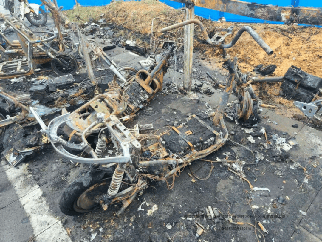 火灾案例:2025年9月7日,文山州文山市开化街道螺峰社区都市盛林小区5栋一电动车发生火灾,未造成人员伤亡,该起火灾造成通信光缆、商户卷帘门及其他6辆电动自行车烧毁,小区单元楼外墙、楼道等公共设施有部分烟熏痕迹,起火原因系一层出口外停放的电动自行车蓄电池故障引发火灾,车辆品牌为雅迪,蓄电池品牌为大疆。